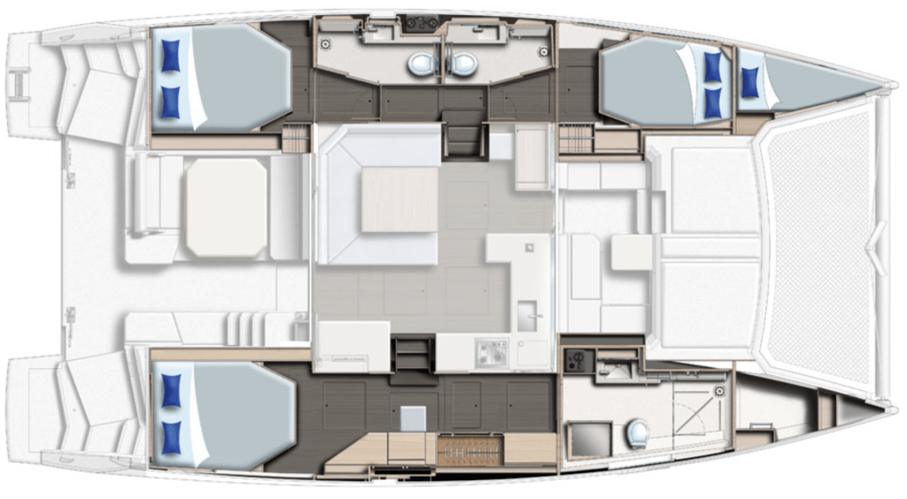 - Because the cabins are located fore and aft in each hull it gives you full privacy and you do not hear anything from one cabin to the next